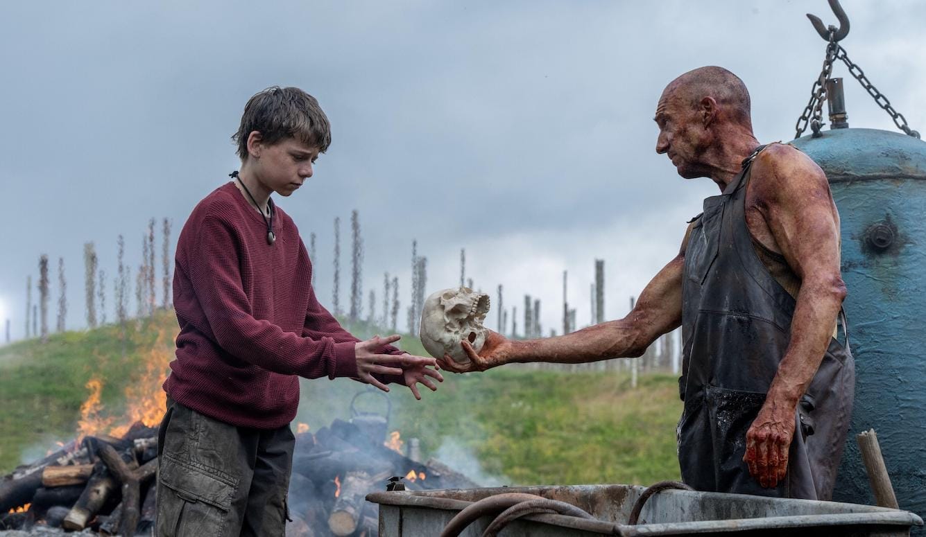 We then meet Jamie (Aaron Taylor-Johnson)—not Jimmy but a completely different character—who is planning to take his twelve-year-old son, Spike (Alfie Williams), over to the mainland to make his first infected kill, even though we are told that Spike is too young for this rite of passage. Off they go anyway, over the violent objections of Jamie’s wife and Spike’s mother, Isla (Jodie Comer), who spends her days confined to a bed by an unspecified illness. After Spike nails his catch (an obese bellycrawler that feeds on earthworms), he and his father head home. When Spike asks his father about a fire he spots in the distance, Jamie tells him to pay no attention.